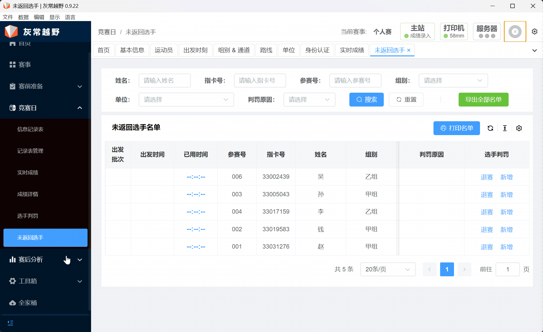 在竞赛日栏目下点击未返回选手,即可对未返回选手进行查看。