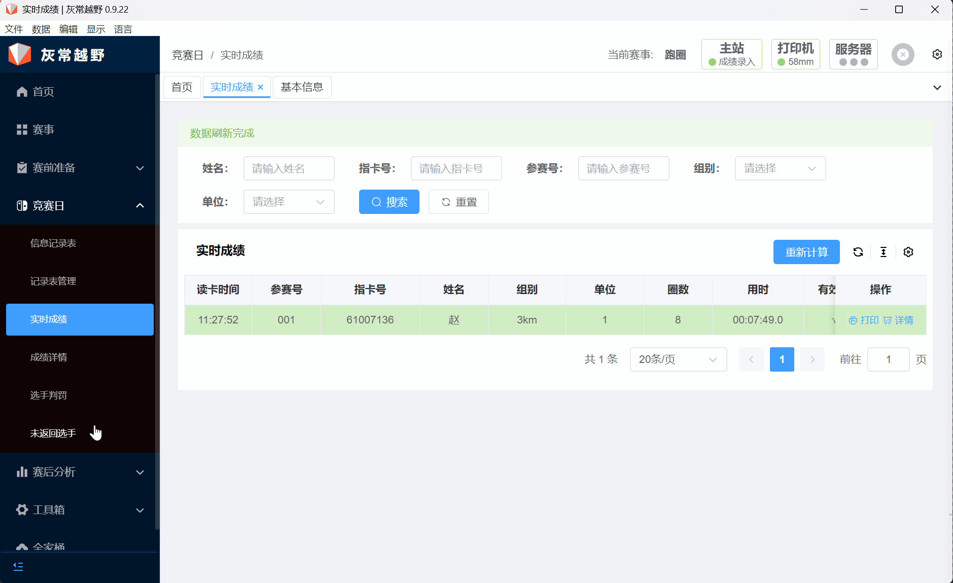 在左侧菜单栏,选择竞赛日栏目下的实时成绩,主站按钮下选择成绩录入,选择好正确的串口,点击 状态 按钮打开,与主站连接正常时,主站会滴一声,左下角红灯会闪烁, 打印机 连接成功会有打印机连接成功提示。