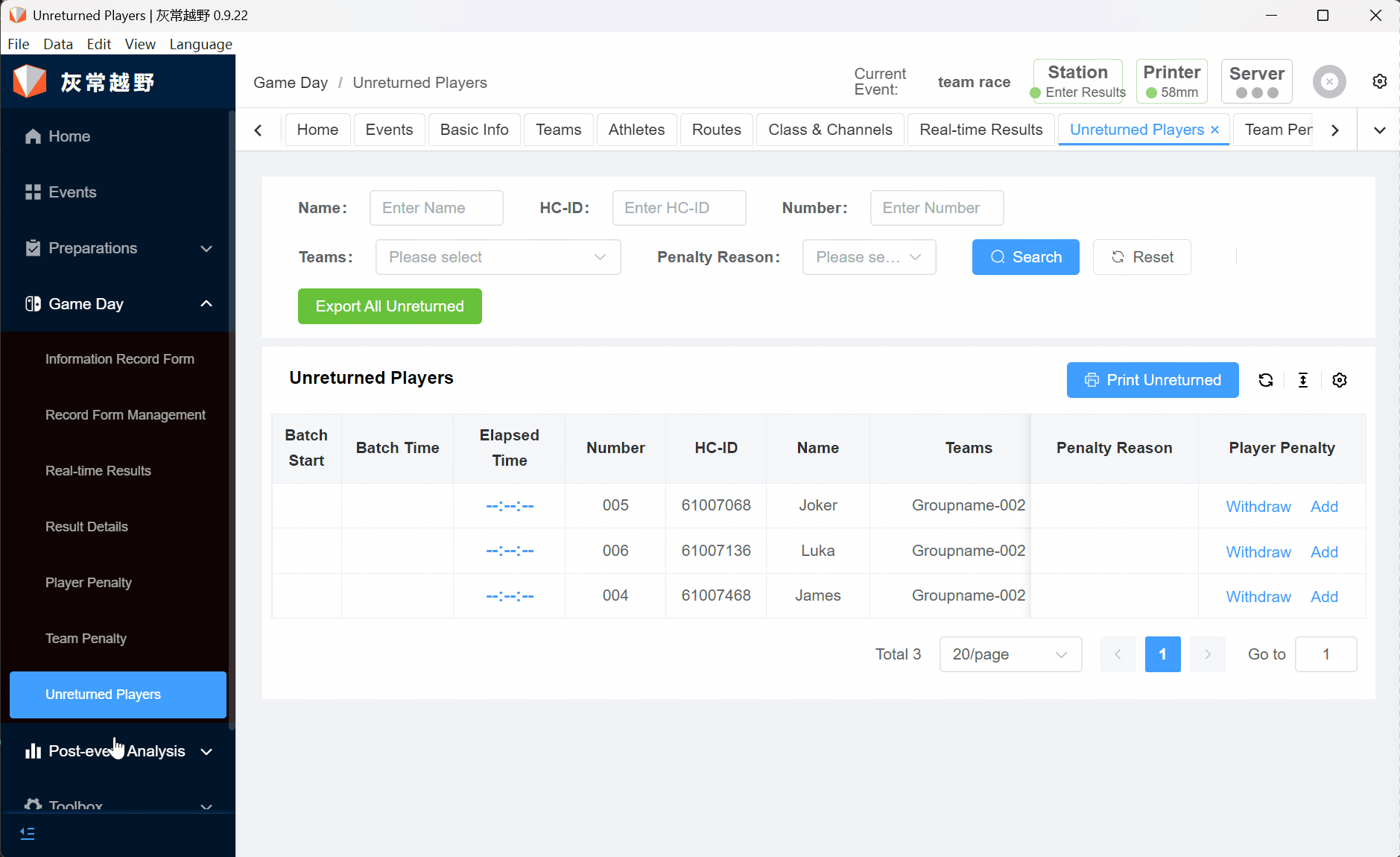 In the Competition Day column, click No Return Athletes, you can view the athletes who have not returned.